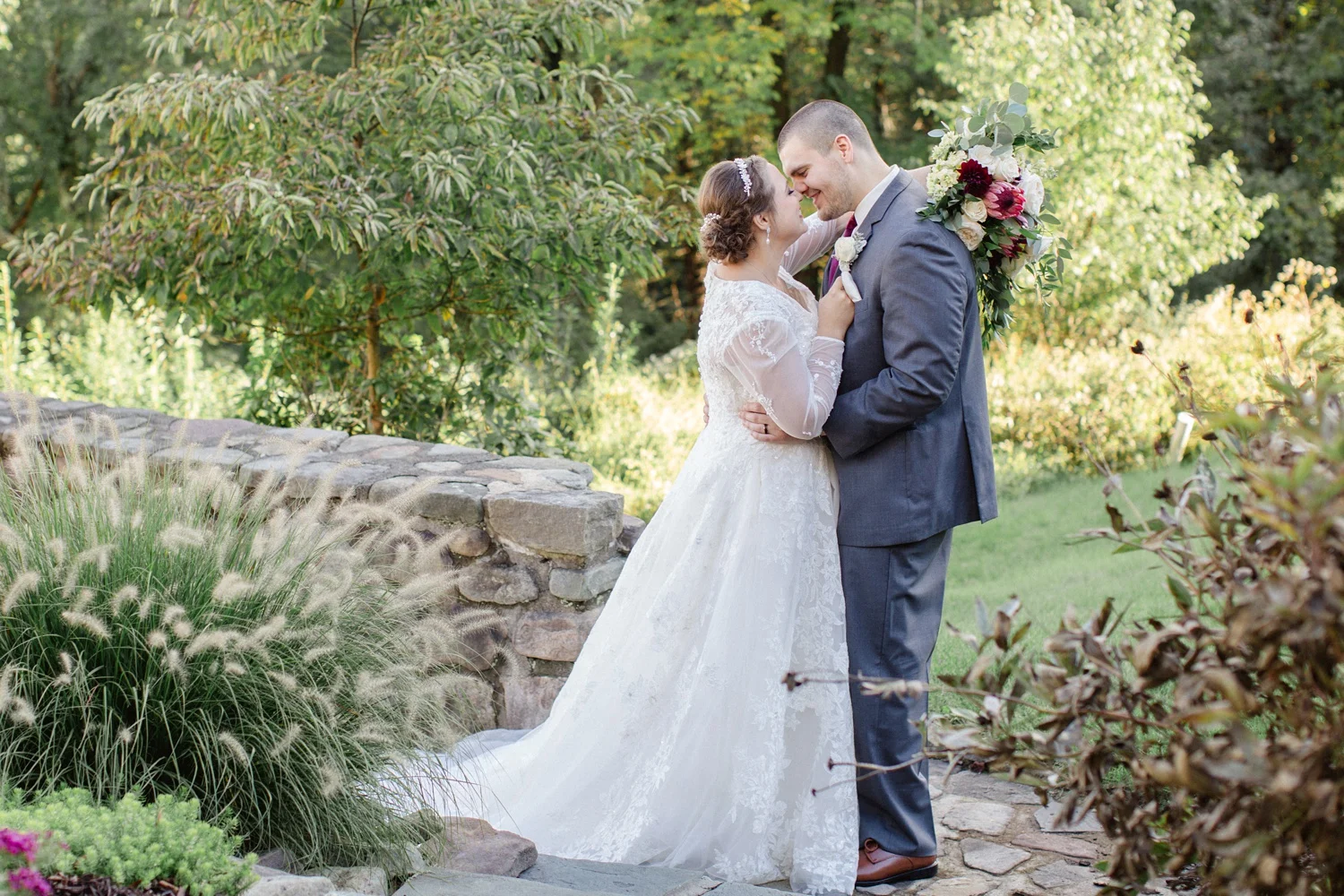 In September I spent the day with Sam + Dominic as they were married at a beautiful outdoor ceremony in the Poconos at the Inn at Pocono Manor. These two are truly some of the nicest people you will meet and I can not get over how stunning their wedding was. Just look at that bouquet! I couldn’t stop talking at hour beautiful her flowers were! And long sleeves on wedding dresses just get me every time. What an honor it was to be a part of their day. Here are a few favorites.